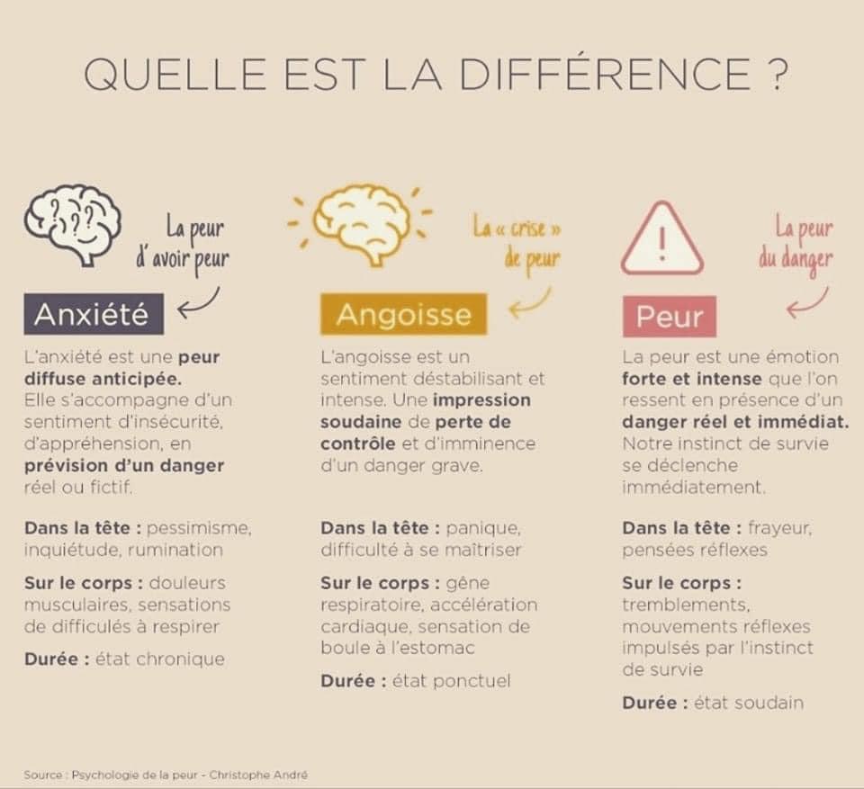 Je ne vais rien réécrire sur l’ANXIETE car je trouve la définition du Larousse Médical juste et précise, accessible. » S’il existe une anxiété « normale » qui améliore l’apprentissage et les performances, l’anxiété peut aussi devenir pathologique… Elle comporte trois caractères principaux : pressentiment d’un danger vague et imminent, réactions physiques variées (sensation d’étouffement, palpitations, sueurs, sécheresse de la bouche, vertiges, tremblements, troubles du transit), impression pénible d’impuissance ou de faiblesse devant la menace, chaque symptôme venant renforcer le qui-vive «